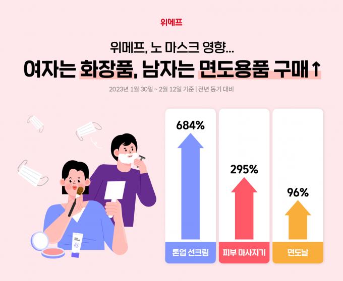 위메프 "노마스크 영향으로 여자는 화장품, 남자는 면도용품 구매 증가"