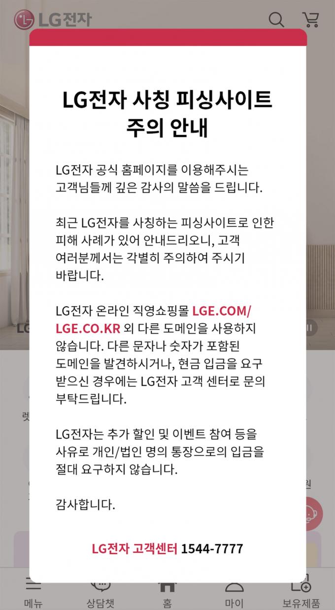 LG전자는 이를 위해 홈페이지(www.lge.co.kr/)에 접속한 고객들에게 온라인 사기 피해에 대한 경고 '팝업 창'을 게시했다. 팝업 창에는 온라인 사기 수법에 대한 주의와 함께 위장사이트나 현금 입금을 유도하는 사례 발견 시 제보해 달라는 메시지를 담았다.