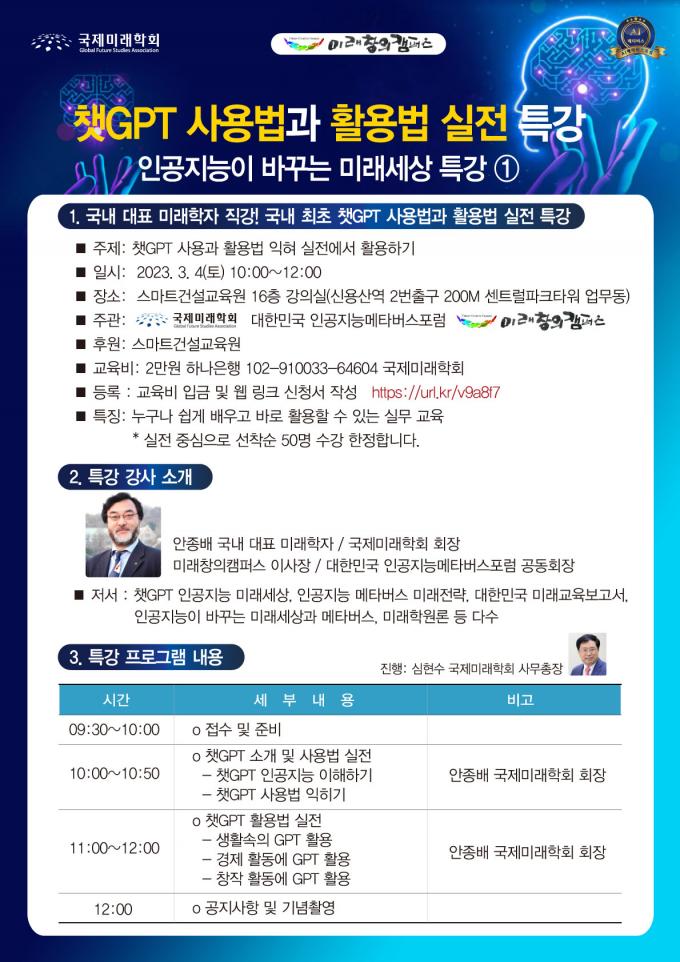 특강은 오는 3월 4일 오전 10시~12시, 신용산역 인근의 스마트건설교육원 16층 강의실에서 열릴 예정이다. 국제미래학회, 대한민국 인공지능메타버스포럼, 미래창의캠퍼스 주관으로 진행된다.