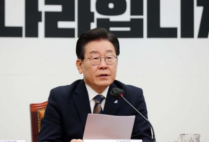 ▲ 더불어민주당 이재명 대표가 16일 국회에서 긴급 최고위원회의를 주재하며 검찰의 구속영장 청구와 관련한 강경한 입장을 밝히고 있다. [뉴시스]