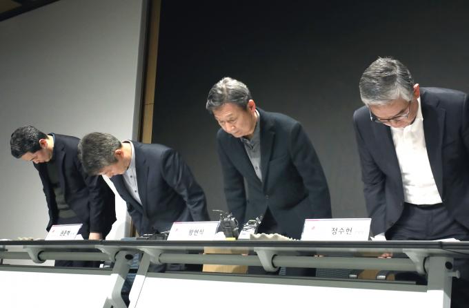 ▲ 황현식 LG유플러스 대표(왼쪽에서 세번째)와 경영진들이 고객정보 유출과 인터넷 접속 오류 사고에 대해 고개 숙여 사과하고 있다. [LG유플러스 제공]