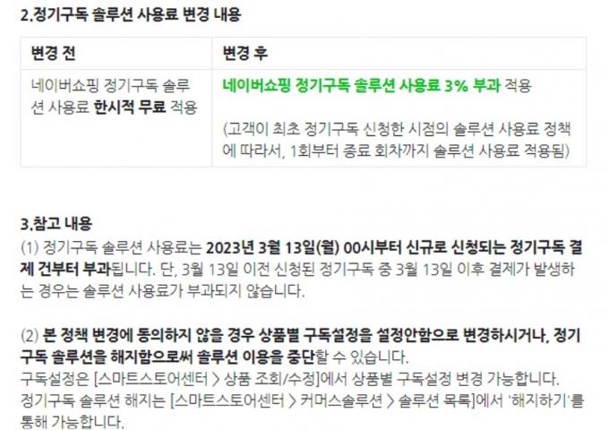 네이버는 상품별 구독설정을 설정안함으로 변경하거나 정기구독 솔루션을 해지하더라도 3월 13일 이전에 신청된 정기구독은 지속 이행할 의무가 있다고 안내했다. 해당 정기구독 잔여회차 결제 건에 대해서는 솔루션 사용료를 부과하지 않기로 했다.