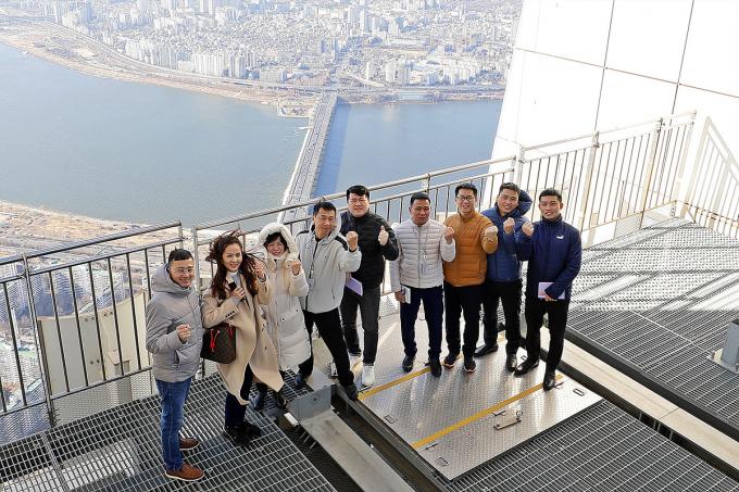 ▲ P&D 베트남 직원들이 롯데월드타워 랜턴(최상부)에서 기념사진을 촬영하고 있다. [롯데물산 제공]