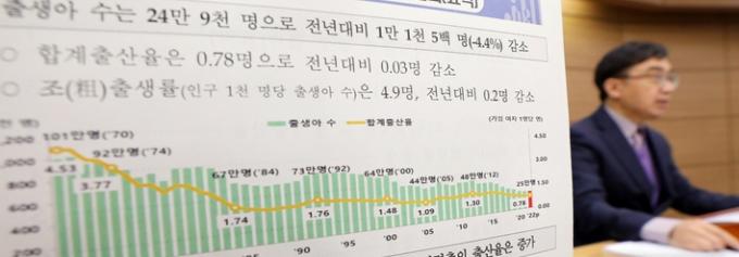 2021년(0.81명)보다 0.03명 감소해 0.7명대에 처음 진입했다. 이는 통계 집계를 시작한 1970년 이후 가장 낮고 경제협력개발기구(OECD) 회원국 중 꼴찌이자 평균의 절반에도 못 미친다. 세계 최저 수준이다.