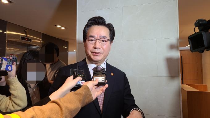 ▲ 정황근 농림축산식품부 장관이 28일 한국식품산업협회에서 식품기업들과의 간담회를 마치고 인터뷰하고 있다. [김지우 기자]