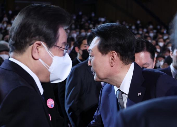 윤석열 대통령은 1일 3·1절 기념식에서 여야 정당 대표와 만나 인사를 나눴다. 윤 대통령은 더불어민주당 이재명 대표와도 악수했으나 대화는 하지 않았다. '냉랭한' 여야 관계가 반영됐다는 해석이 나왔다.