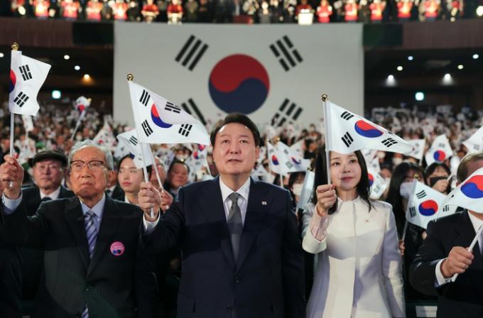 ▲ 윤석열 대통령과 부인 김건희 여사가 1일 서울 중구 유관순 기념관에서 열린 제104주년 3·1절 기념식에서 만세삼창을 한 뒤 태극기를 흔들고 있다. [대통령실 제공]