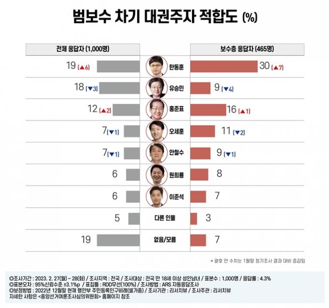 보수층에서도 한 장관이 30%로 1위였다. 전달 대비 7%p 올랐다. 홍 시장은 1%p 상승한 16%였다.