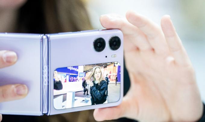 ▲ 2일 스페인 바르셀로나에서 열린 '모바일 월드 콩그레스(MWC) 2023' 중국 오포 전시관에서 직원이 '오포 파인드2 플립' 폴더블 스마트폰의 카메라 기능을 시연하고 있다. [AP 뉴시스]