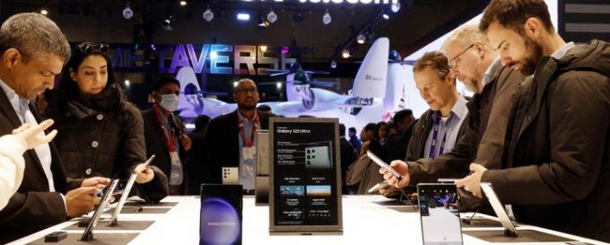 ▲ 지난달 28일(현지시간) '모바일월드콩그레스(MWC) 2023'가 열린 스페인 바르셀로나 피라 그란 비아에 설치된 삼성전자 부스에서 관람객들이 갤럭시 S23울트라 스마트폰을 살펴보고 있다. [AP 뉴시스]