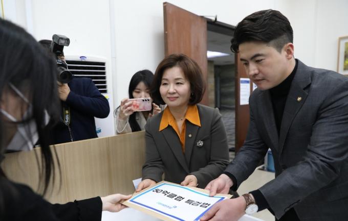▲ 더불어민주당 이수진(왼쪽), 오영환 원내대변인이 3일 국회 의안과에 '대장동 50억 클럽 특검법안'을 제출하고 있다. [뉴시스]