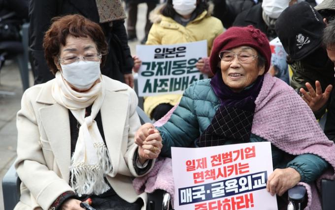 강제징용 배상 확정판결 피해자와 지원단체, 대리인단은 6일 "한국 행정부가 일본 강제동원 가해 기업의 사법적 책임을 면책시켜주는 것"이라고 반발했다.