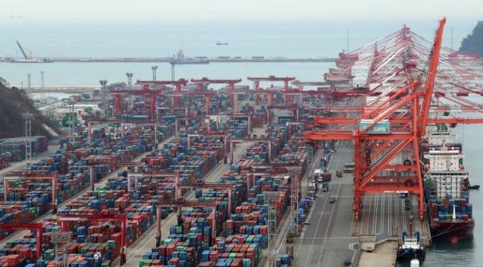 ▲ 지난 1일 부산 남구 신선대부두에서 컨테이너 선적과 하역작업이 분주하게 진행되고 있다. [뉴시스]