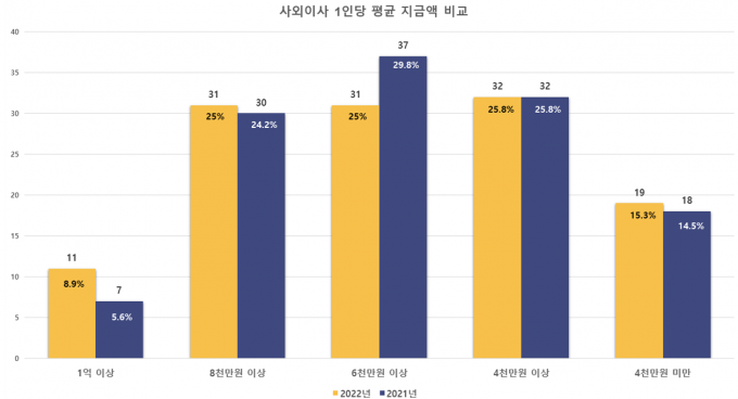 사외이사들의 연봉이 1억 원 미만 8000만 원 이상인 곳은 31개로 전체 구간 중 비중이 가장 높았다. 8000만 원에서 6000만 원인 기업은 31개, 6000만 원에서 4000만 원 32개, 사외이사 연봉이 4000만 원 이하인 기업은 19개였다.