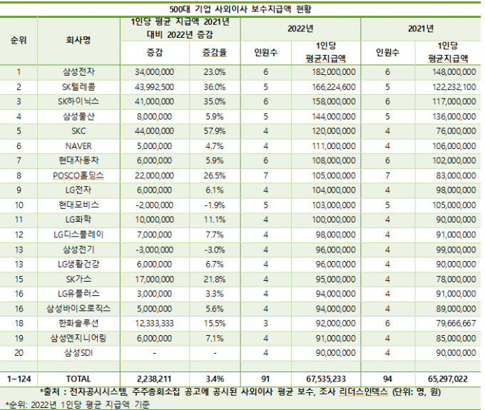 기업별로는 SK텔레콤은 자사주로 지급된 보수를 포함해 1억6622만 원, SK하이닉스 1억5800만 원, 삼성물산 1억4400만 원, SKC 1억2000만 원, 네이버 1억1100만 원, 현대자동차 1억800만 원, 포스코홀딩스 1억500만 원, LG전자 1억400만 원, 현대모비스 1억300만 원, LG화학 1억 원이었다.