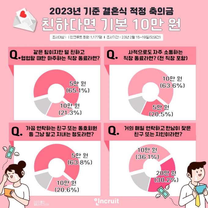 '가끔 연락하는 친구 또는 동호회 일원 등 그냥 알고 지내는 정도'에도 63.8%가 5만 원을 꼽았다. 10만 원은 20.6%였다.
