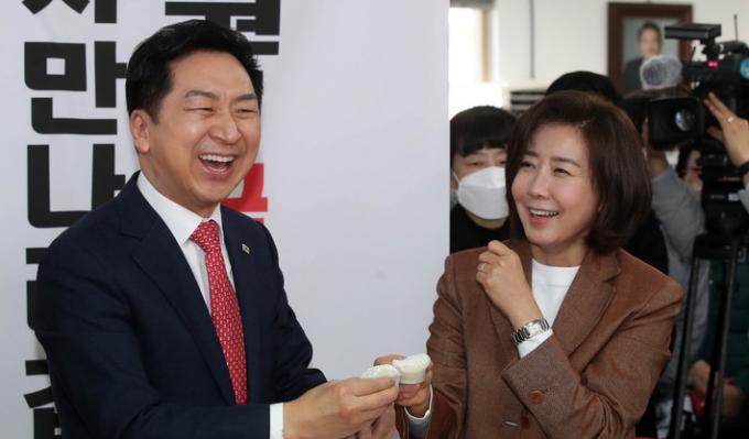 ▲ 국민의힘 김기현 당대표 후보(왼쪽)와 나경원 전 의원이 지난 6일 서울 동작구 동작을 당협위원장 사무실에서 열린 당원간담회에서 찹쌀떡을 먹고 있다. [뉴시스]