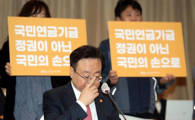 ▲ 조규홍 보건복지부 장관이 7일 오후 서울 중구 프레지던트호텔에서 열린 제1차 국민연금기금운용위원회에서 자료를 살펴보고 있다. 조 장관 뒤로 공적연금강화 국민행동 회원들이 '국민연금 기금 개악 반대' 피켓을 들고 항의 시위를 하고 있다. [뉴시스]