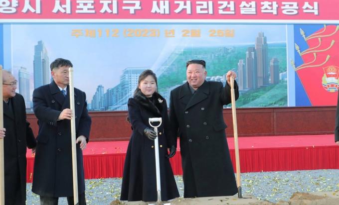 ▲ 북한 김정은 국무위원장이 지난달 25일 평양 서포지구 새거리 건설 착공식에 딸 김주애와 함께 참석해 시삽 후 삽을 잡고 있다. 북한 조선중앙통신은 이틀 뒤 이 사진을 공개했다. [뉴시스]