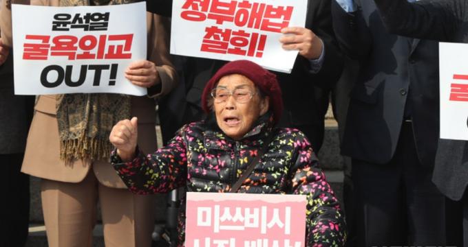 이날 행사에 참석한 미쓰비시 근로정신대 피해자인 양금덕 할머니는 "아흔다섯 먹고 (이렇게) 억울한 적은 처음"이라며 "윤석열은 어느 나라 사람인지 모르겠다. 하루속히 물러가라"고 분노를 표출했다.