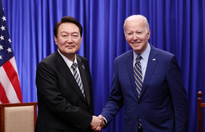 ▲ 윤석열 대통령과 조 바이든 미국 대통령이 지난해 11월13일(현지시간) 캄보디아 프놈펜 한 호텔에서 한미 정상회담을 하기 전 악수하고 있다. [대통령실 제공]