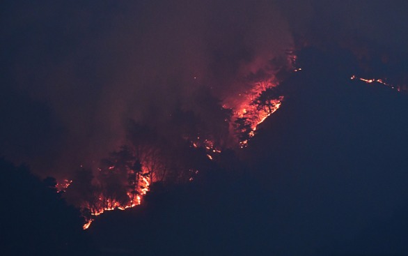 강풍 타고 번져 진화율 10% …소방당국, 송전탑 가동 중단