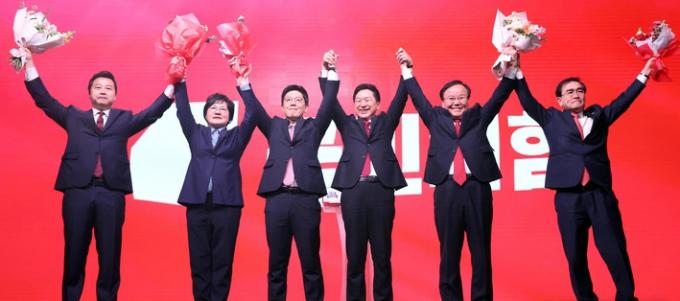 ▲ 국민의힘 김기현 신임 당대표(오른쪽 세번째)가 8일 경기 고양시 킨텍스에서 열린 제3차 전당대회에서 승리한 뒤 신임 최고위원, 청년최고위원과 포즈를 취하고 있다. [뉴시스]