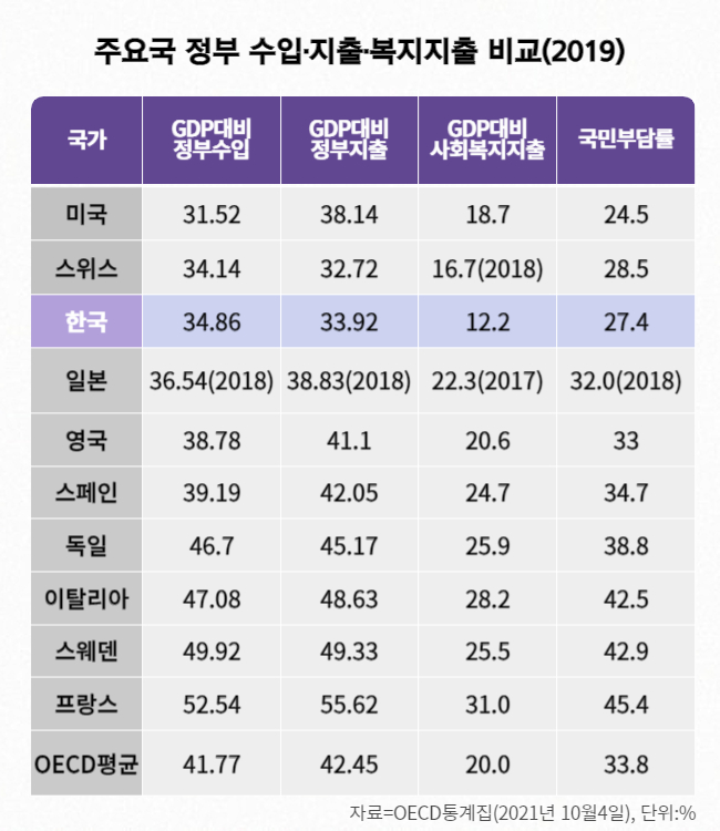 이에 따라 한국의 정부수입은 2019년 기준 GDP의 34.8%로 미국(31.5%), 스위스(34.1%)보다 높고, 일본(36.5%)보다 약간 낮다. 그런데 같은해 GDP대비 사회복지지출은 한국이 12.2%로, 미국(18.7%), 스위스(16.7%, 2018), 일본(22.3%, 2017)보다 상당히 낮다.