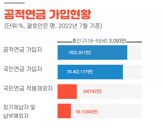 우리나라의 경우 연금 납부대상자인 18~59세 인구(3093만 명) 중 37%인 1136만 명이 연금 보험료를 정상적으로 내지 못하고 있다(도표 참조.) 소득이 없는 배우자 등 연금 제외 적용자가 742만 명에 달하며, 어려운 경제 여건 등으로 장기 체납하거나 납부예외자로 인정받은 사람도 394만 명이나 된다. 특히 가입률이 낮고, 가입기간이 짧은 661만 명의 지역가입자(자영업자, 임시·일용직, 특수형태 근로자 등) 중 59.6%가 사각지대에 놓여 있다.
