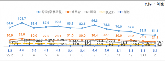 지역별로는 중국을 포함해 모든 지역에서 수출 감소세가 두드러졌다. 중국(홍콩 포함)에서 39.4%, 베트남 31.7%, 미국 20.7%, 유럽연합 23.5%, 일본 4.8% 줄었다.