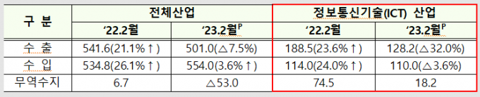 수입도 줄었다. 2월 ICT 수입액은 110억 달러로 지난해 같은 기간보다 3.6% 감소했다.