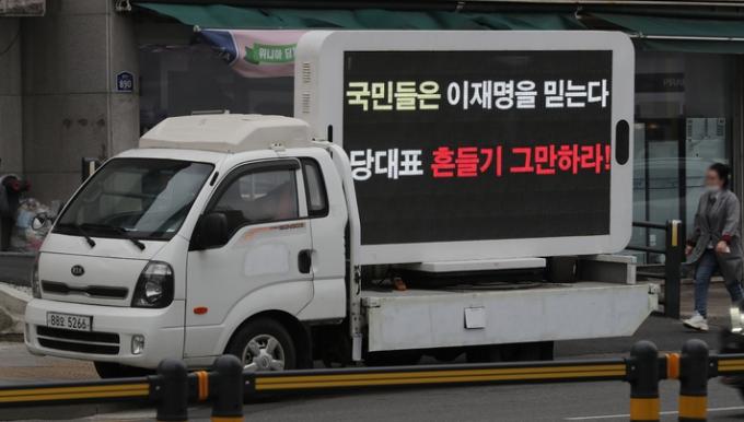 LED전광판 트럭…"대표 흔들기 그만하라" 등 문구