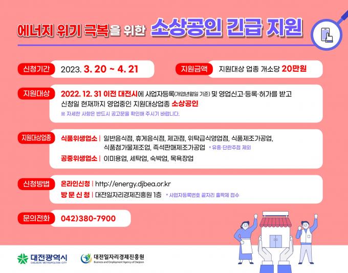 지원대상은 2022년 12월 31일 이전 대전시에 영업신고·등록·허가를 받고, 신청일 현재까지 대전 내에 영업장을 두고 식품위생업소와 공중위생업소를 운영 중인 소상공인이다.