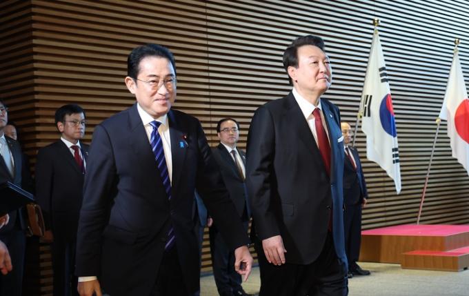 ▲ 윤석열 대통령과 기시다 후미오 일본 총리가 16일 도쿄 총리 관저에서 의장대 사열을 마친 뒤 정상회담을 하기 위해 이동하고 있다. [뉴시스]