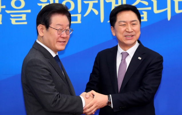 ▲ 국민의힘 김기현 대표(오른쪽)가 지난 15일 국회에 있는 더불어민주당 당대표실로 이재명 대표를 예방해 인사를 나누고 있다. [뉴시스]