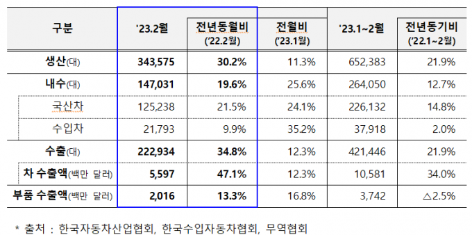 자동차 생산은 차량용 반도체 공급난 완화와 조업일수 증가 영향으로 지난해 2월보다 30.2% 증가한 34만3575대에 달했다.