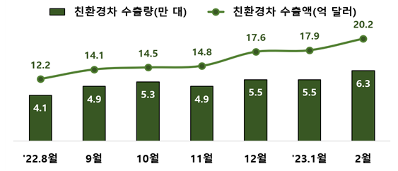 친환경차 수출액은 지난해 8월부터 6개월 연속으로 증가했다. 수출액이 20억 달러를 넘어선 것은 이번이 처음이다.