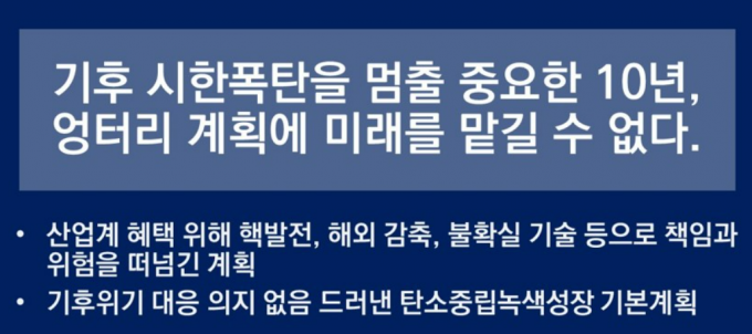이에 대해 시민단체인 에너지정의행동은 이날 '기후 시한폭탄을 멈출 중요한 10년, 엉터리 계획에 미래를 맡길 수 없다'는 제목의 성명을 내고 정부 계획에 반발했다.