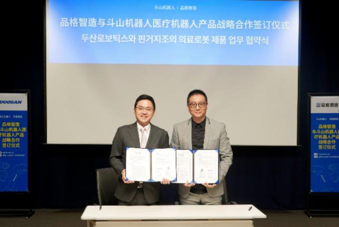 두산로보틱스는 21일 경기도 성남시 분당두산타워에서 중국 시스템 통합(SI) 업체인 핀거지조(Guangxi Pinge digital industry intelligent)와 '협동로봇 의료용 솔루션 개발 및 판매'를 위한 업무협약(MOU)을 체결했다.