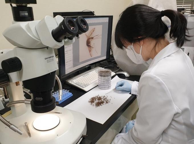 ▲경기도보건환경연구원 실무자가 말라리아 모기를 분류하고 있다. [경기도 제공]