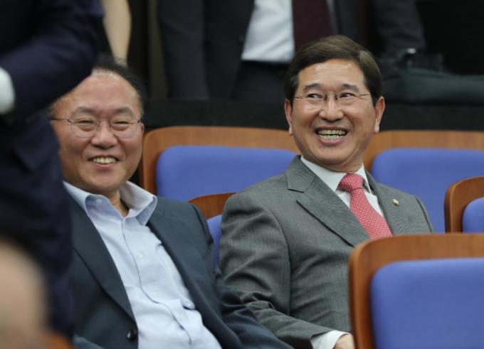 ▲ 국민의힘 윤재옥(왼쪽), 김학용 의원이 지난달 30일 오전 서울 여의도 국회에서 열린 의원총회에 자리하고 있다. [뉴시스]