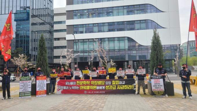 한편 이날 오전 회사 앞에서는 전국식품산업노동조합연맹 한국노총 소속 아워홈노동조합이 집회를 열고 목소리를 높였다. 노조 측은 "천문학적 배당 안을 당장 철회하고 피땀 흘려 노력하는 아워홈 직원들에게 성과급을 지급하라"고 주장했다.