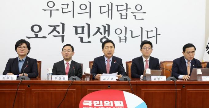 ▲ 국민의힘 김기현 대표가 6일 국회에서 열린 최고위원회의에서 발언하고 있다. 왼쪽과 오른쪽은 조수진, 태영호 최고위원. [뉴시스]