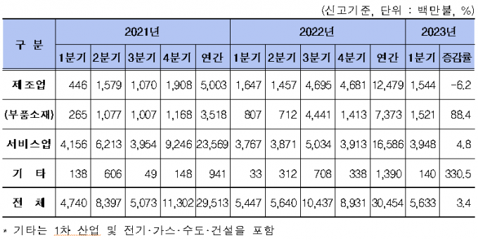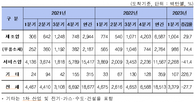제조업 전체로는 외국인들의 투자가 줄어 올해 1분기 동안 15.4억 달러가 신고돼 전년동기 대비 6% 감소했다. 이와 달리 서비스업은 39.5억 달러로 지난해보다 5% 증가했다.