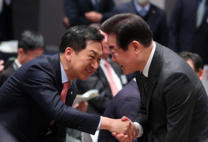 ▲ 국민의힘 김기현(왼쪽), 더불어민주당 이재명 대표가 6일 서울 중구 한국프레스센터에서 열린 제67회 신문의날 기념식에서 만나 악수하고 있다. [뉴시스]