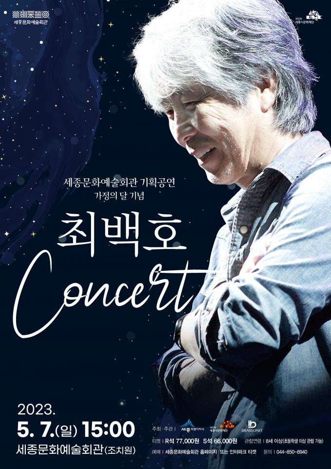 5월 7일 세종문화예술회관에서 세종시문화재단은 가정의 달을 맞아 오는 5월 7일 오후 3시 세종문화예술회관에서 '최백호 콘서트'를 갖는다.
