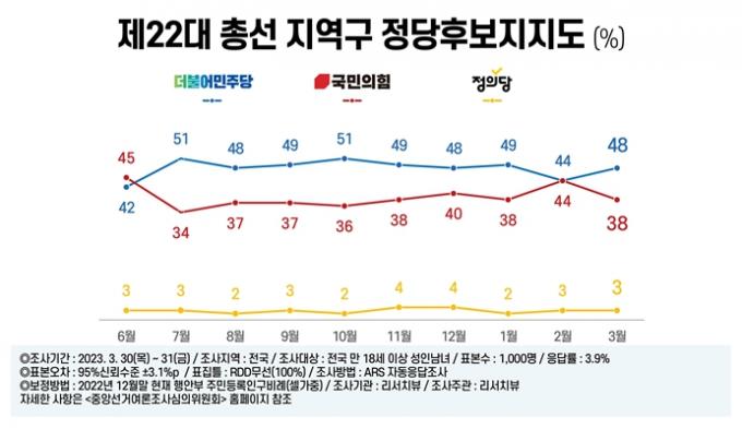 리서치뷰가 이날 발표한 3월 정기여론조사에 따르면 '오늘이 22대 지역구 국회의원을 뽑는 선거일이라면 어느 정당 후보에게 투표하겠느냐'는 질문에 국민의힘 후보를 선택한 응답은 38%로 나타났다. 더불어민주당 후보를 꼽은 응답은 48%였다.