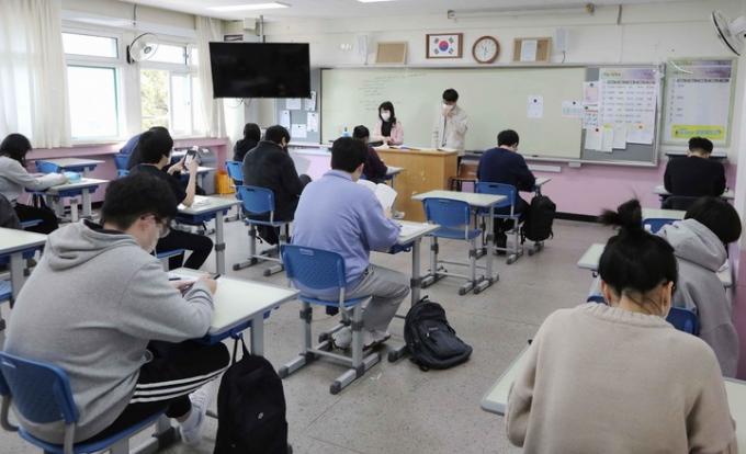 ▲ 국가공무원 9급 공개경쟁채용 필기시험일인 지난 8일 서울 서초구의 한 학교 시험장에서 수험생들이 시험 시작을 기다리고 있다. [인사혁신처 제공]