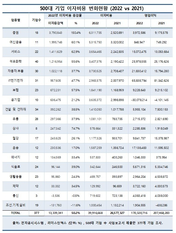11일 기업분석연구소 리더스인덱스(대표 박주근)가 377개 대기업들의 이자비용을 분석한 결과에 따르면 이들의 지난해 이자비용이 39조9166억 원에 달하는 것으로 집계됐다. 직전 해인 2021년 이자비용 26조5773억 원 대비 50.2% 증가한 수치다.