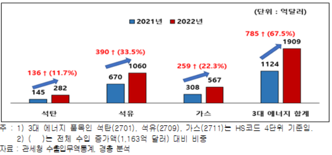 특히 석탄과 석유,가스 등 3대 에너지의 수입단가가 2021년 대비 64.5%나 올랐다. 3대 에너지 수입 증가액은 785억 달러에 달하며 무역적자 규모의 1.6배를 넘어섰다.